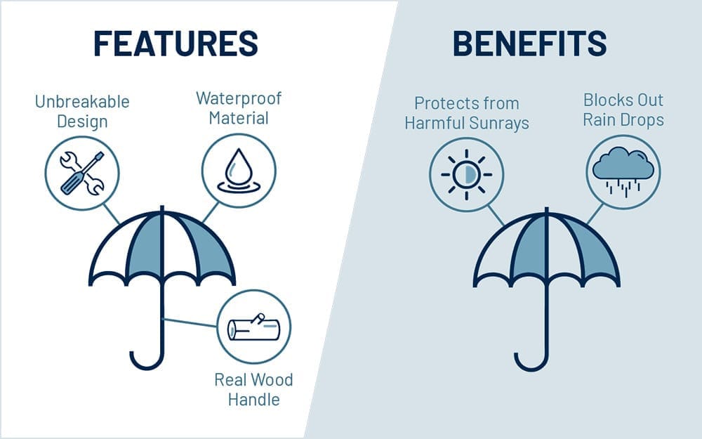 • A feature of a laptop might be “lightweight design,” while the benefit is the convenience of carrying it anywhere without strain.